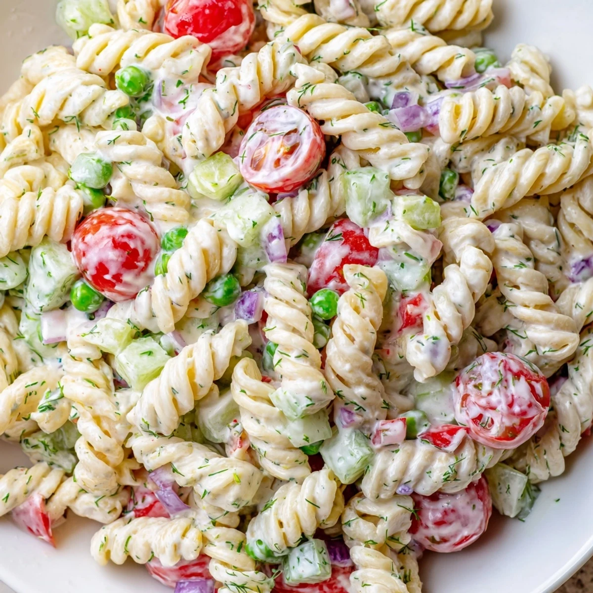 This creamy ranch pasta salad combines al dente pasta with a medley of fresh vegetables including cherry tomatoes, crisp cucumber, colorful bell peppers, and sweet peas. The homemade dressing features mayonnaise, sour cream, and buttermilk blended with dill, chives, and aromatic seasonings. Ready in just 25 minutes, this versatile dish serves six and gets even better after chilling, making it perfect for meal prep or advance preparation.
