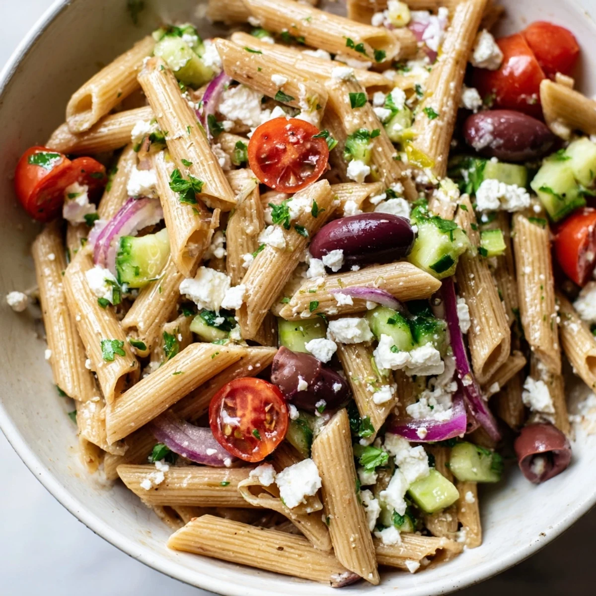 This vibrant Mediterranean-inspired pasta salad brings together crisp fresh vegetables, salty feta cheese, and a bright zesty dressing for a satisfying dish. Perfect for warm weather gatherings, meal prep, or as a colorful addition to any table.