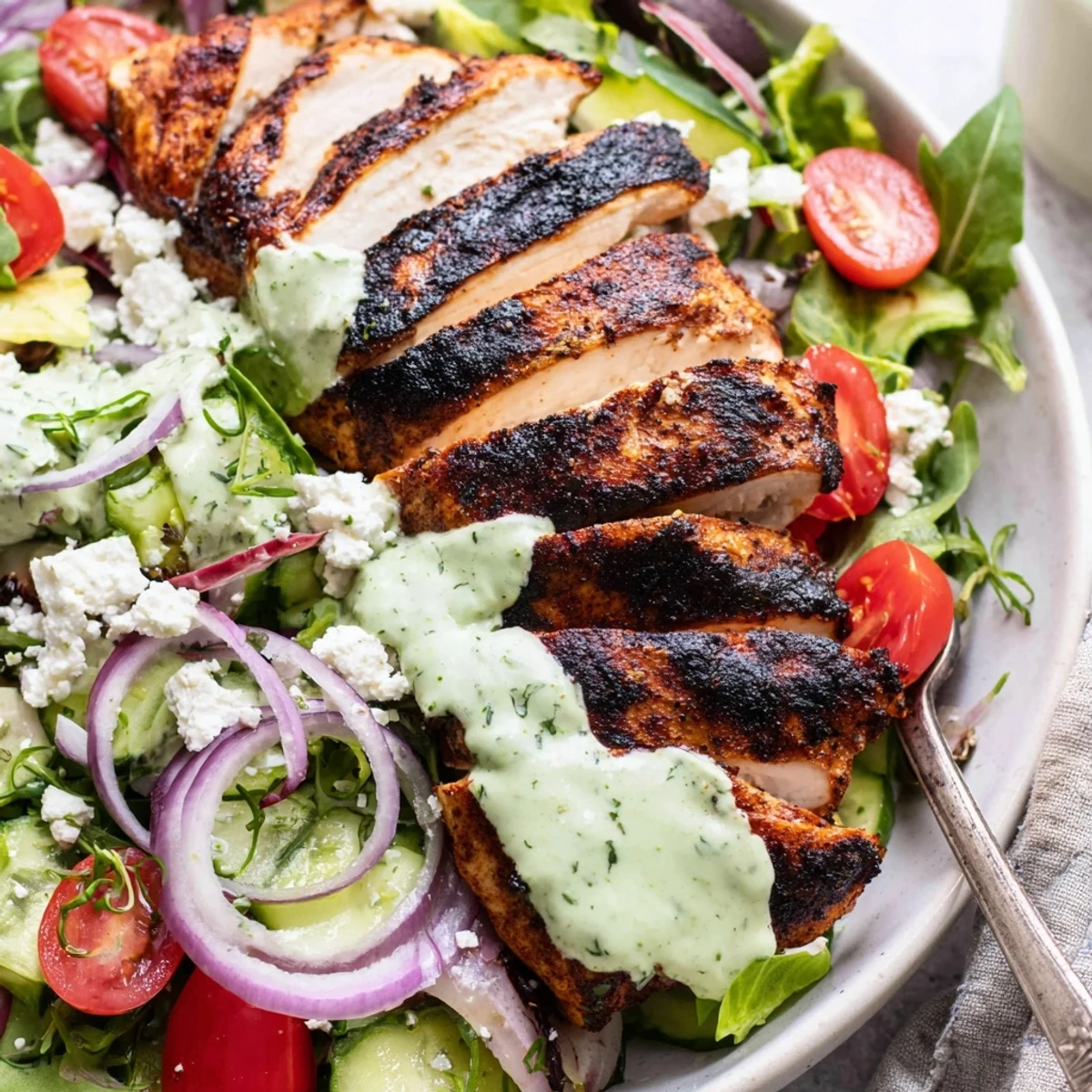 Grill seasoned boneless chicken breasts until just cooked through, then rest and slice thinly. Toss mixed greens with cherry tomatoes, cucumber, red onion and bell pepper. Blend ripe avocado with herbs, chives, garlic, Greek yogurt, lime and olive oil into a smooth, tangy dressing; thin with water if needed. Top greens with sliced chicken and drizzle dressing just before serving.
