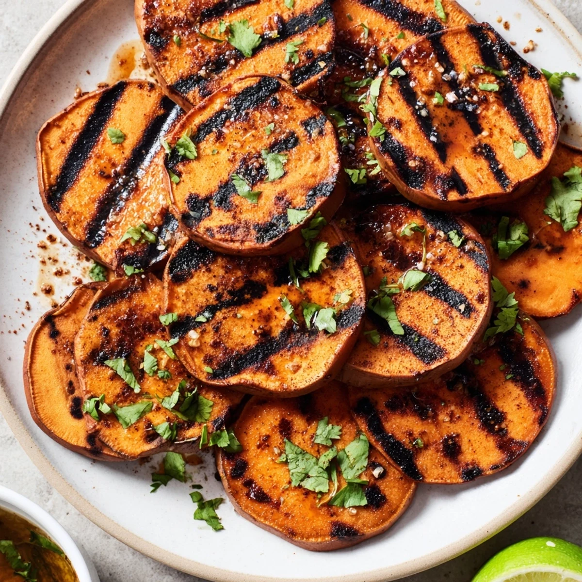 Thin rounds of sweet potato are brushed with olive oil, tossed with smoked paprika, garlic powder, salt and pepper, then seared over a hot grill until marked and tender. Grill 6–8 minutes per side for caramelized edges. Finish with flaky sea salt, chopped cilantro or parsley and a squeeze of lime. Variations: add chipotle for extra smoke or parboil slices briefly for faster cook time.
