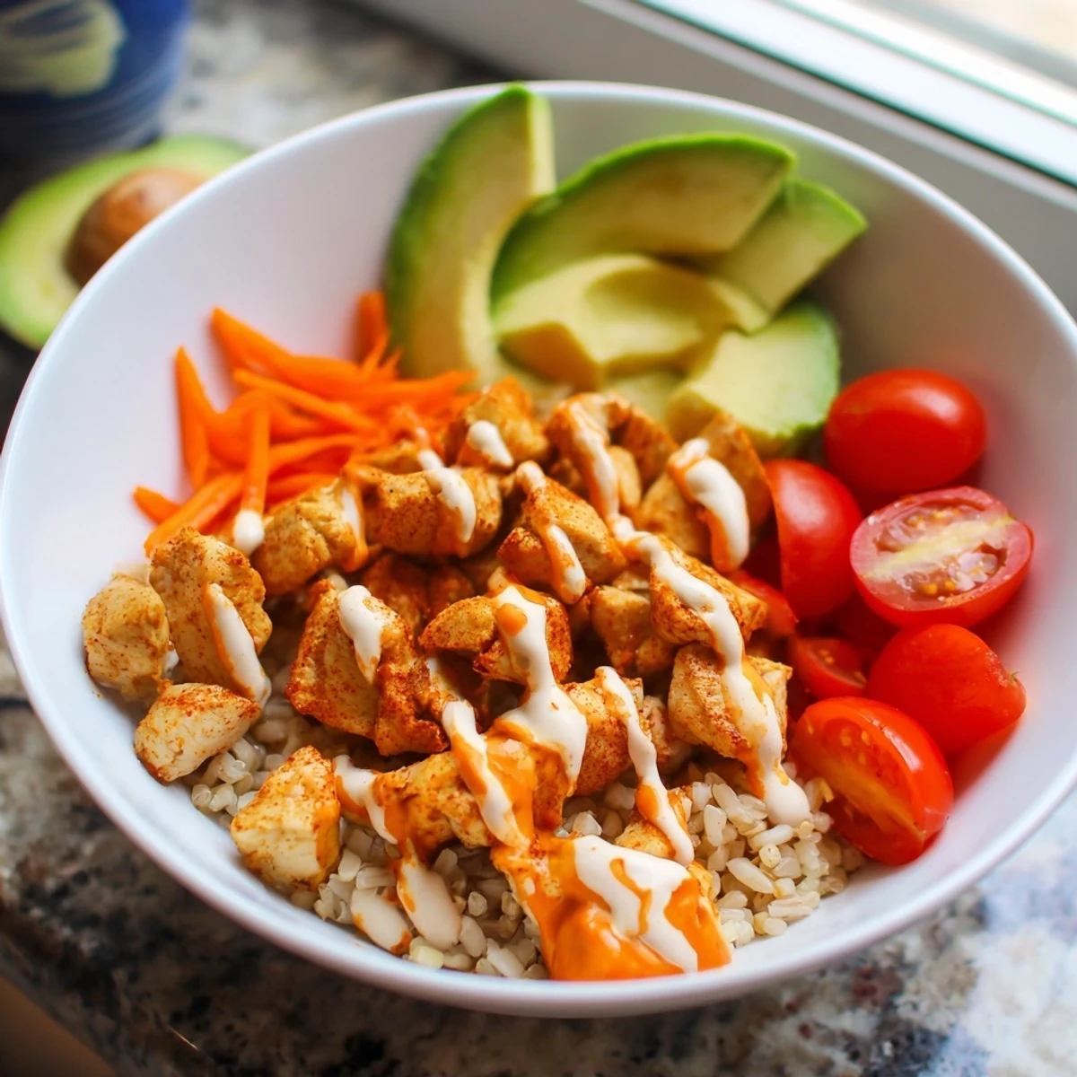 This vibrant lunch bowl combines tender chicken seasoned with smoked paprika and cayenne pepper, served over fluffy brown rice. Fresh cherry tomatoes, cucumber, shredded carrots, spinach, and avocado bring a colorful, nourishing mix. The zesty sauce with Greek or coconut yogurt, Sriracha, lime, and cilantro adds a bold kick. Garnished with toasted sesame seeds and lime wedges for extra texture and brightness, it's a flavorful, easy-to-make dish perfect for a quick midday energy boost.